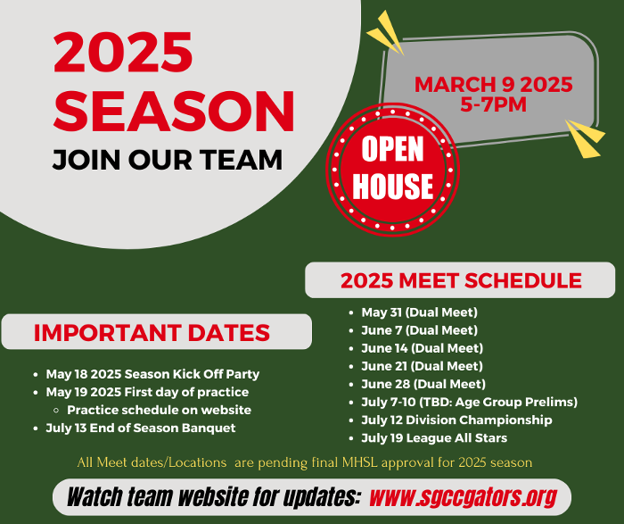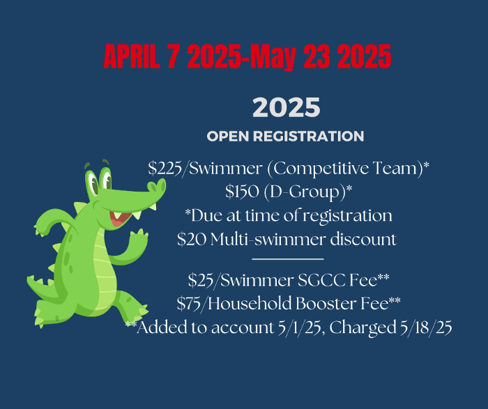 Greetings Gator Family. Pre-season preparations are in full swing and the board wants you to be in the know as we get ready to launch into another fun filled summer swim season.